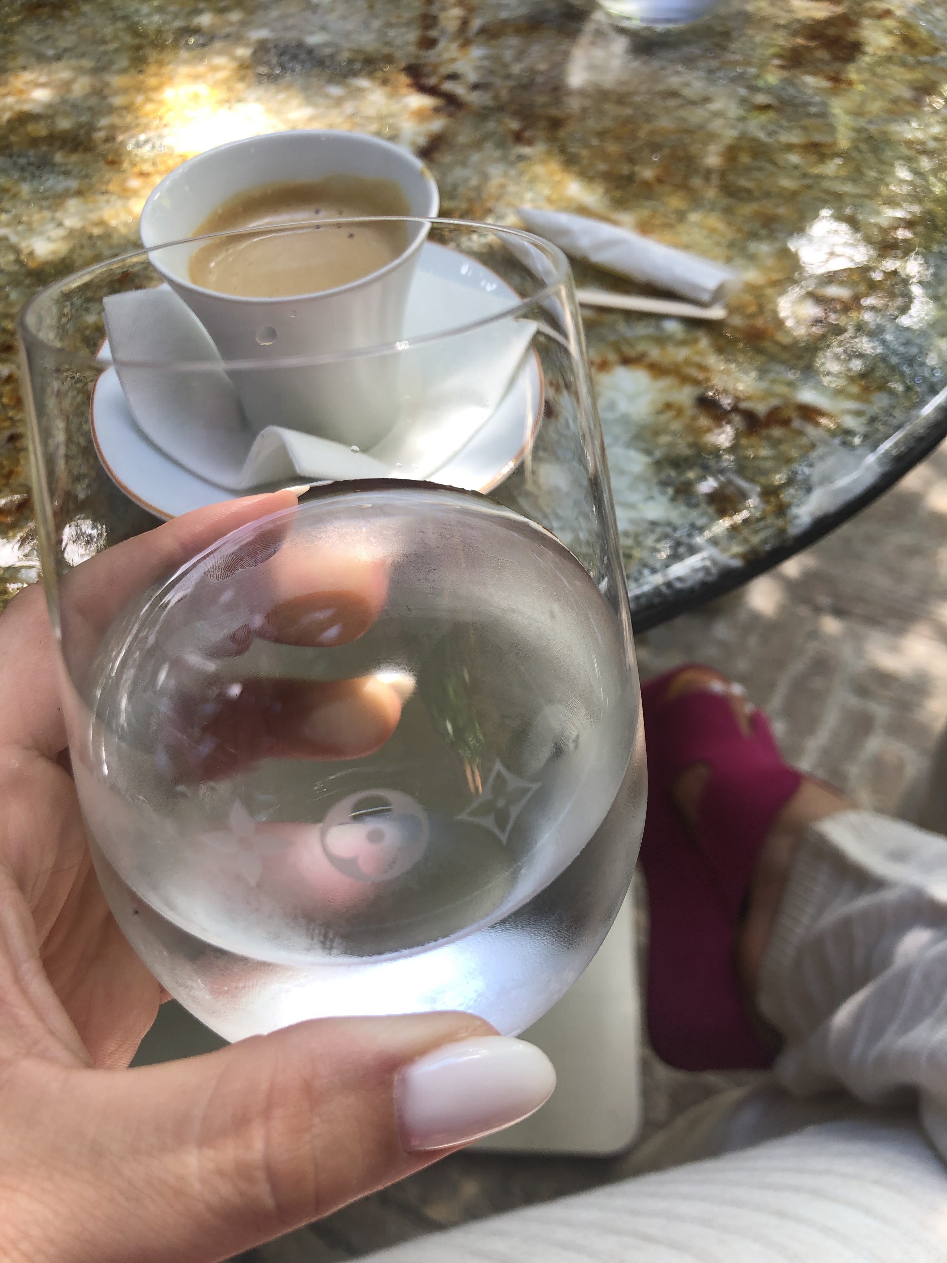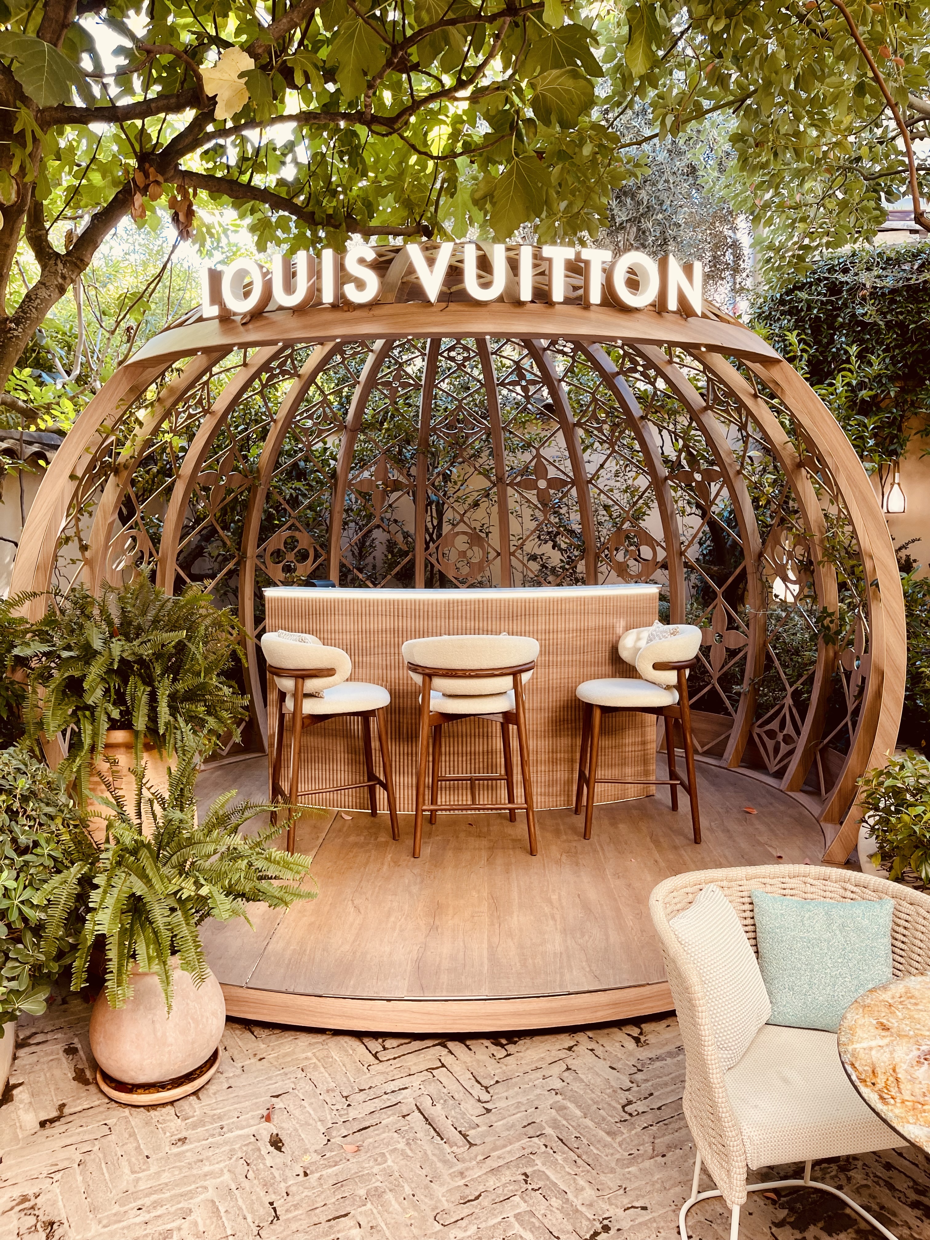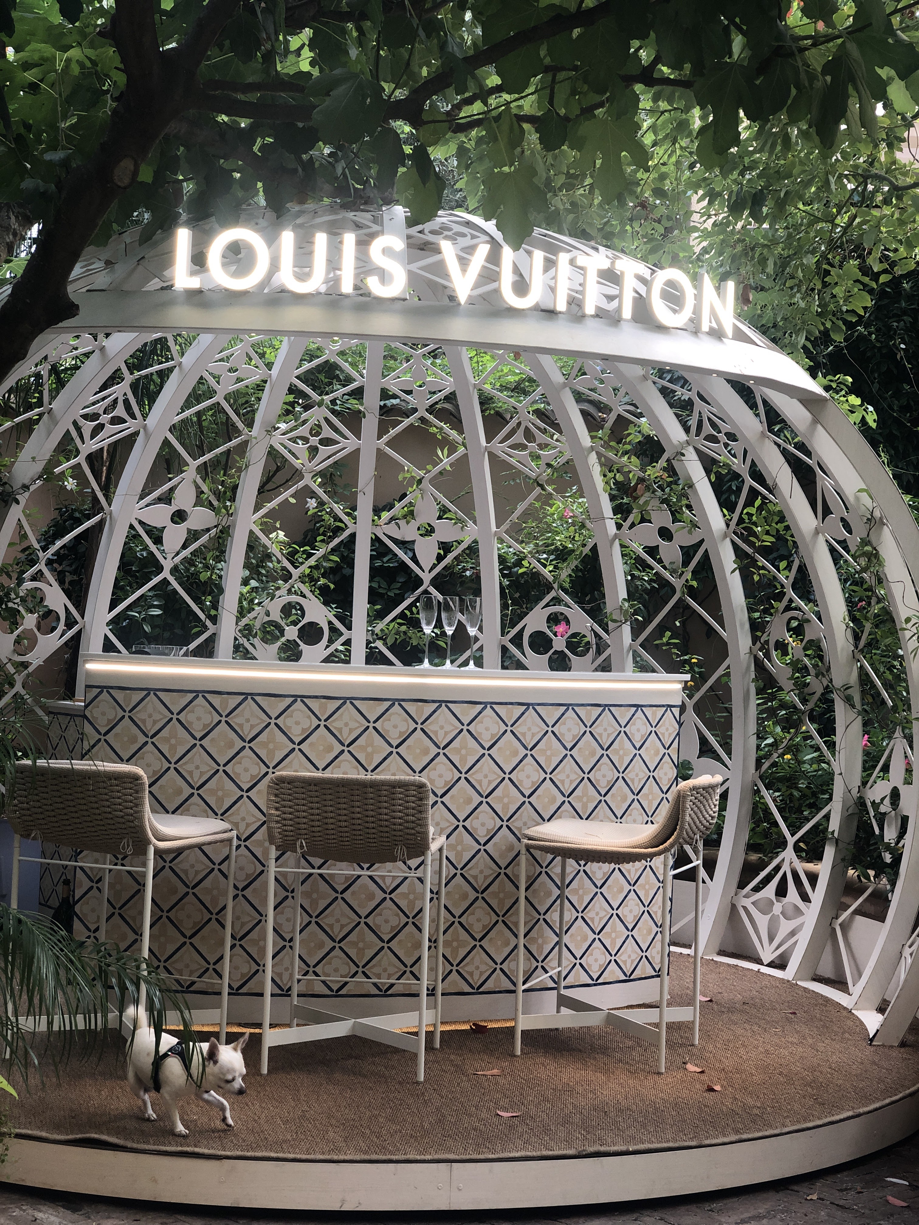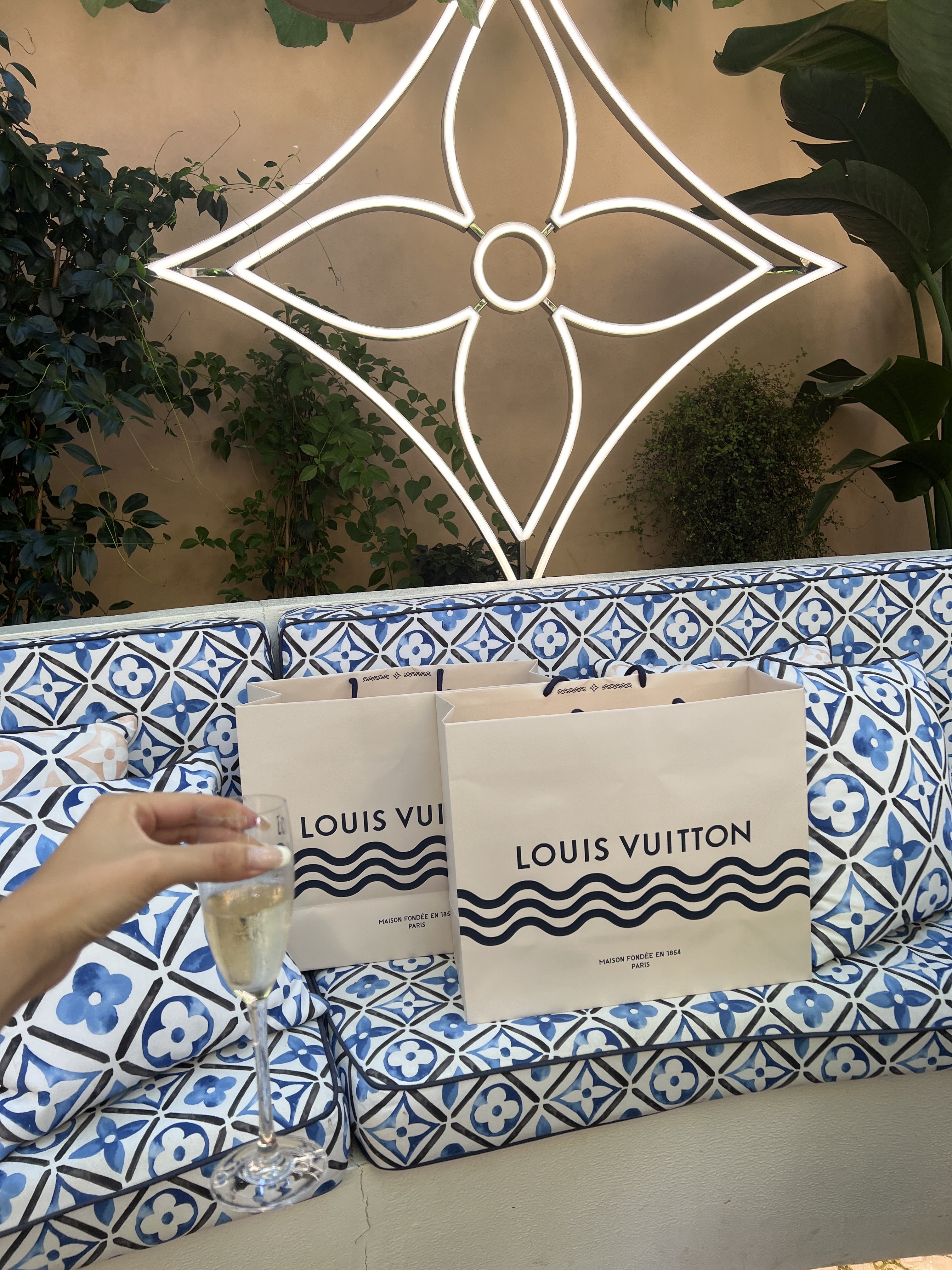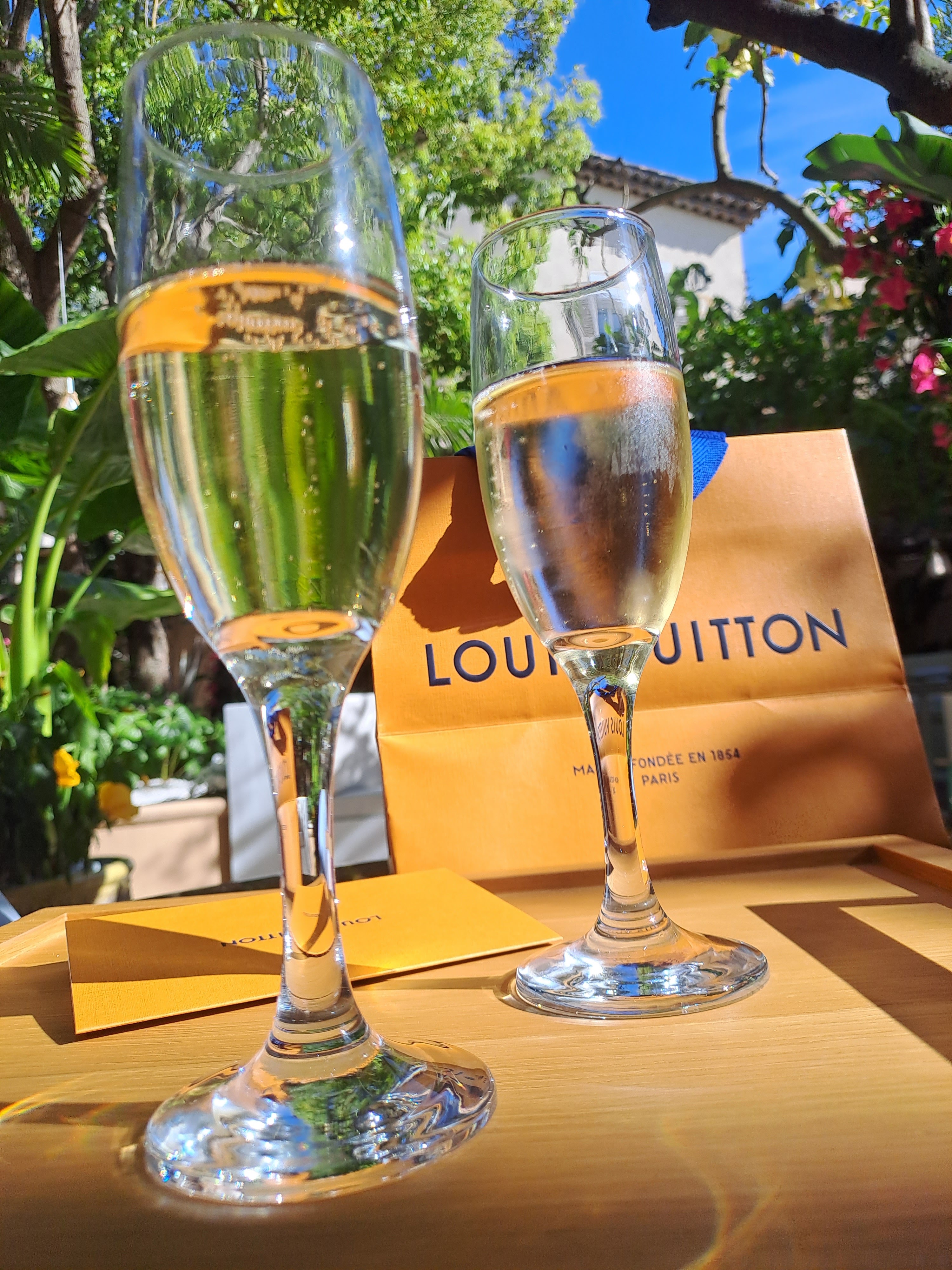Champagne, expresso, sorbet dans ses magnifiques jardins en attendant notre spécialiste. Très beau magasin de luxe avec un personnel sympa. Samita du Mali était très gentille. J'adore ce LV